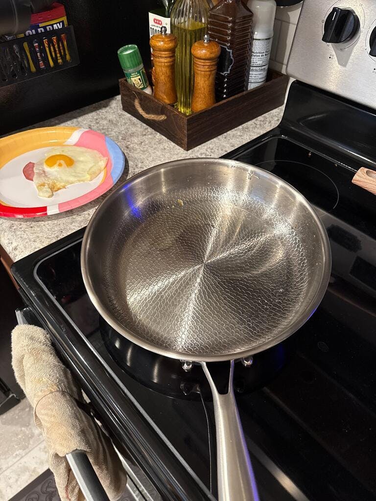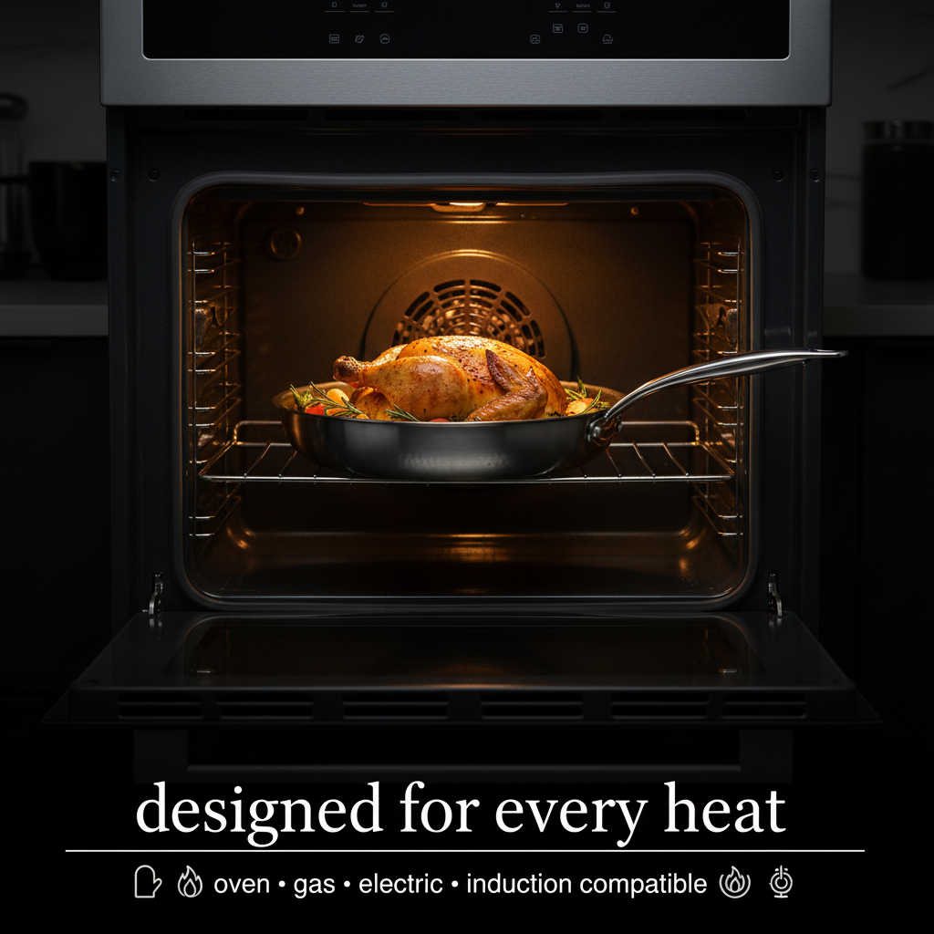 Three layer build with a 1mm aluminum core sandwiched between titanium and stainless steel. Delivers professional-level heat distribution from edge to center. The thickness prevents warping and ensures precise temperature control for perfect cooking results