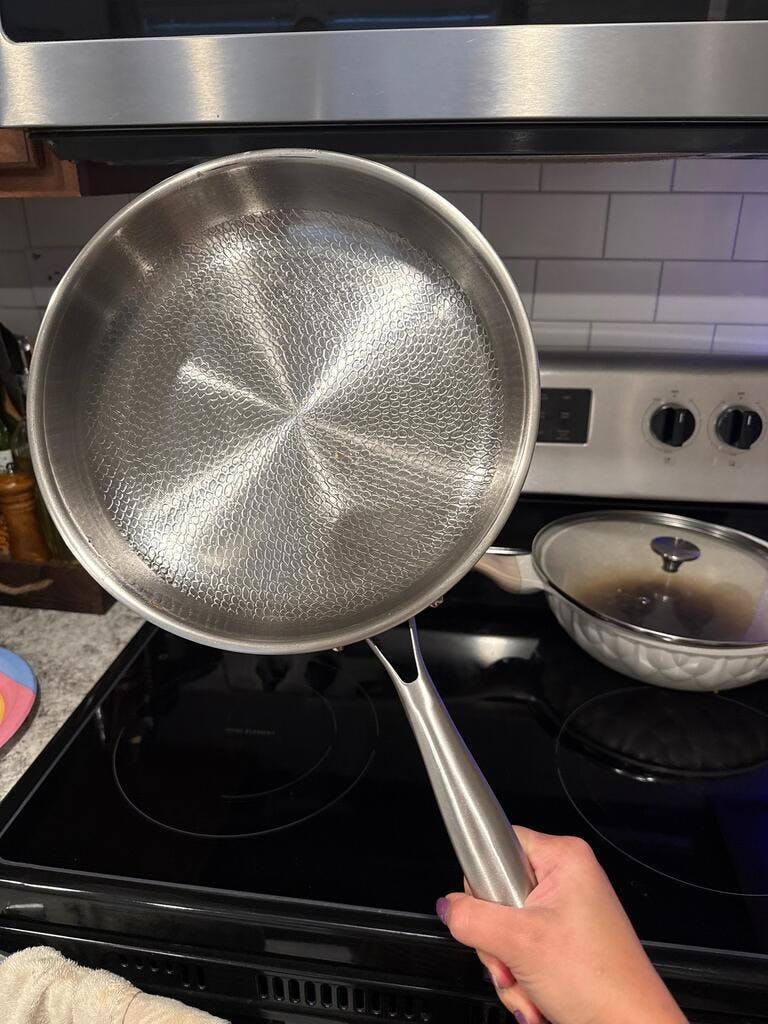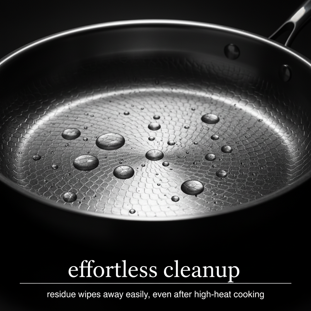 The hammered surface reduces contact with food, preventing sticking and making cleanup effortless. Residue wipes off easily, even after high-heat cooking. Dishwasher safe.